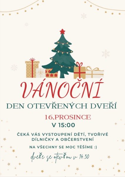 Den otevřených dveří - Vánoční tvoření Srdečně Vás zveme dne 16.12.2025 od 15:00h na VÁNOČNÍ DEN OTEVŘENÝCH DVEŘÍ a společné tvoření s dětmi.